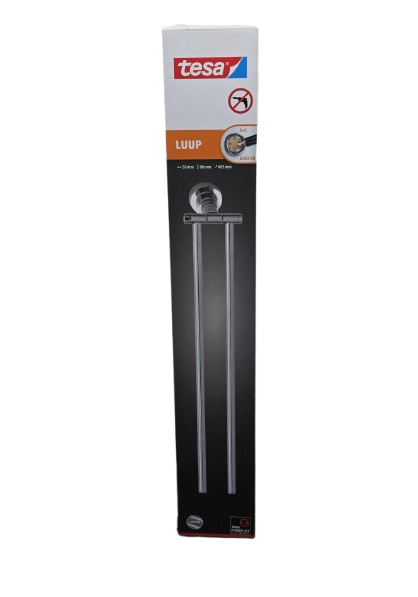 Diseño moderno y funcional. Este porta toalla doble giratorio de la línea LUUP de TESA combina elegancia italiana con máxima practicidad. Fabricado con materiales de alta calidad y acabado cromado resistente a la humedad. Ideal para baños contemporáneos que buscan organización sin perder estilo. Fácil instalación sin taladros gracias a la tecnología adhesiva TESA Power.Kit.